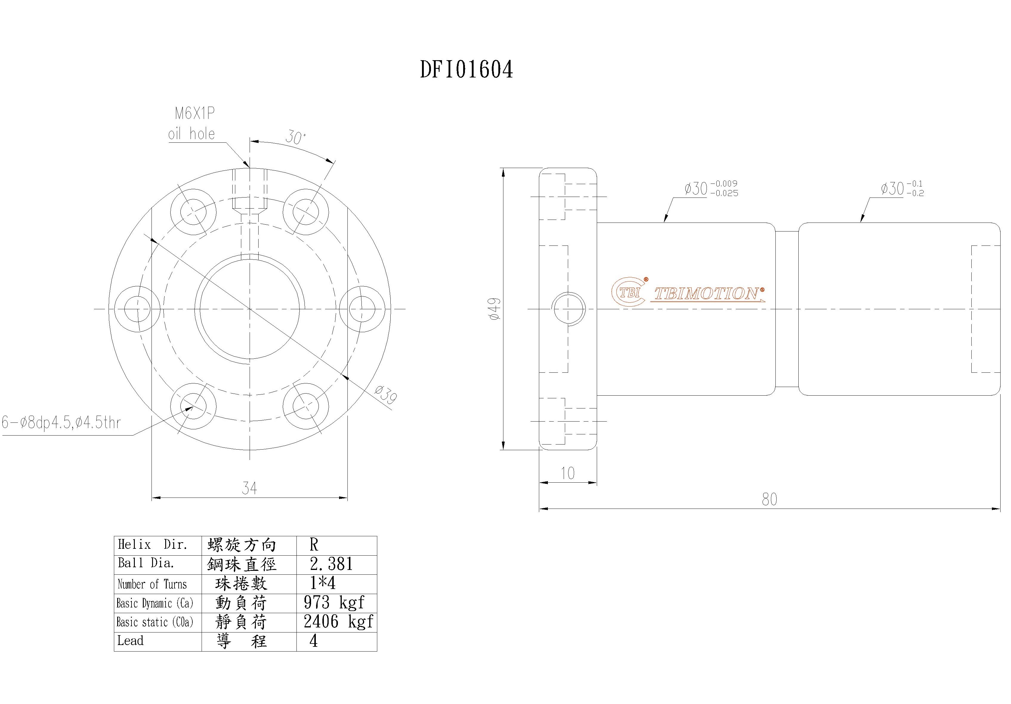 tbi滾珠絲桿螺母DFIR01604T8N,絲桿直徑16,導程04,珠圈數(shù)8,珠直徑2.381,全圓雙螺母,動額定負荷973,靜額定負荷2406,剛性44.
