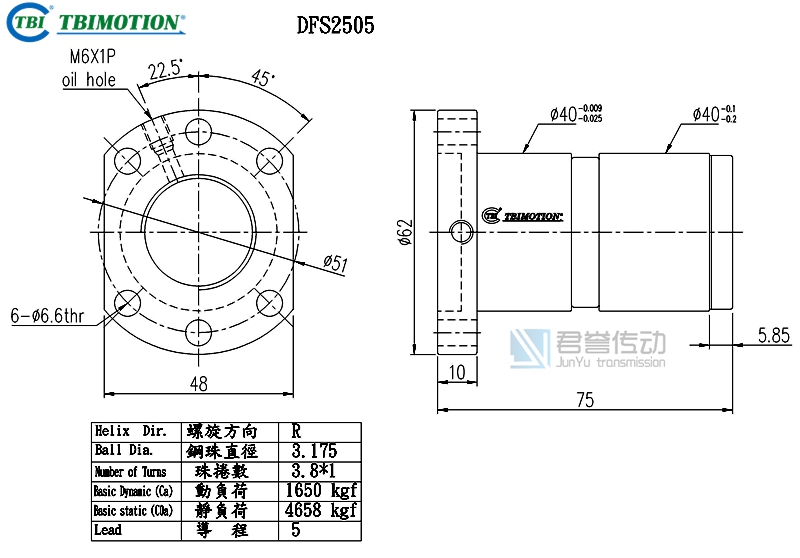 tbi滾珠絲桿螺母DFSR02505T1D,絲桿直徑25,導(dǎo)程05,珠圈數(shù)3.8*1,珠直徑3.175,雙切邊雙螺母,動(dòng)額定負(fù)荷1650,靜額定負(fù)荷4658,剛性59.