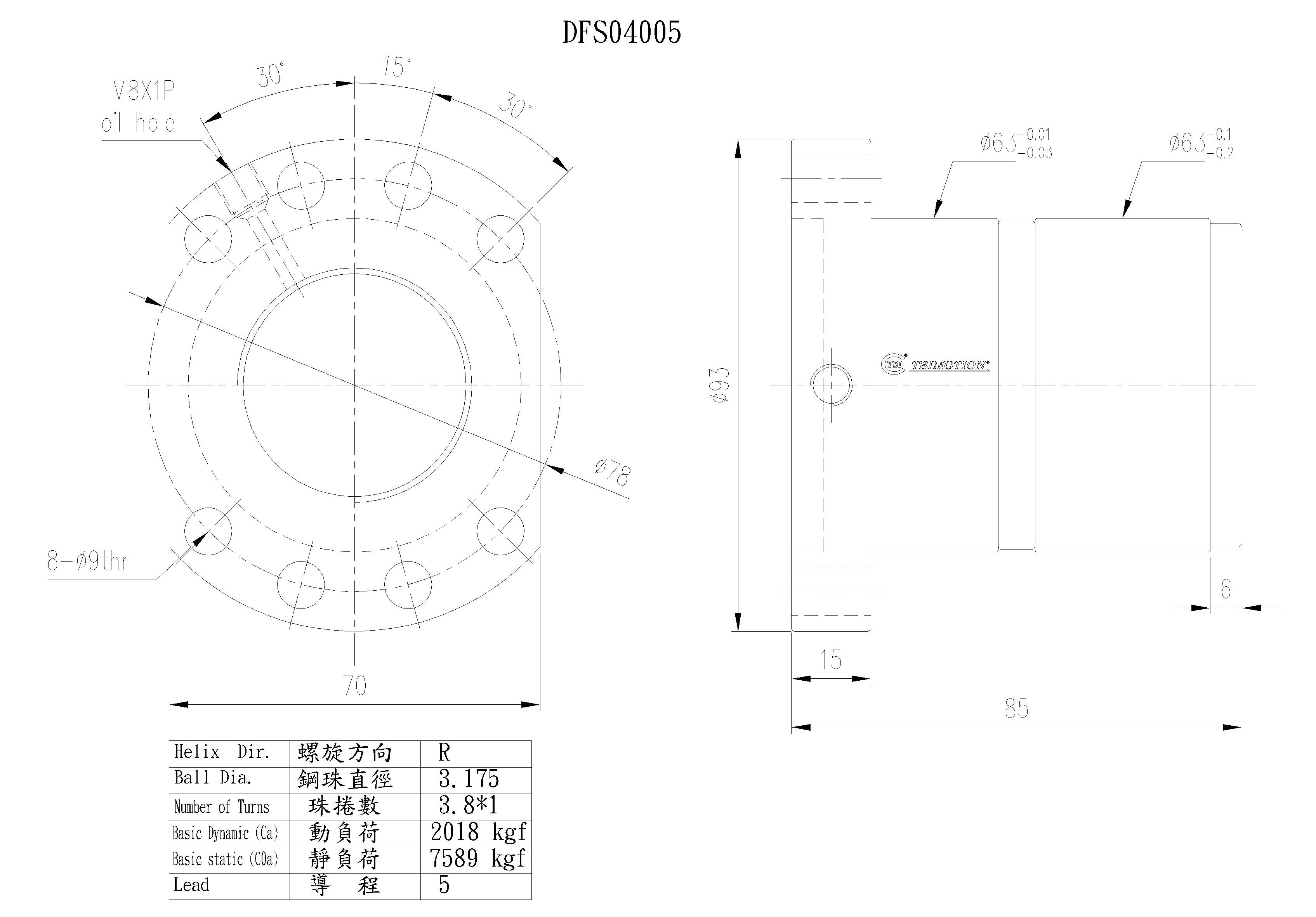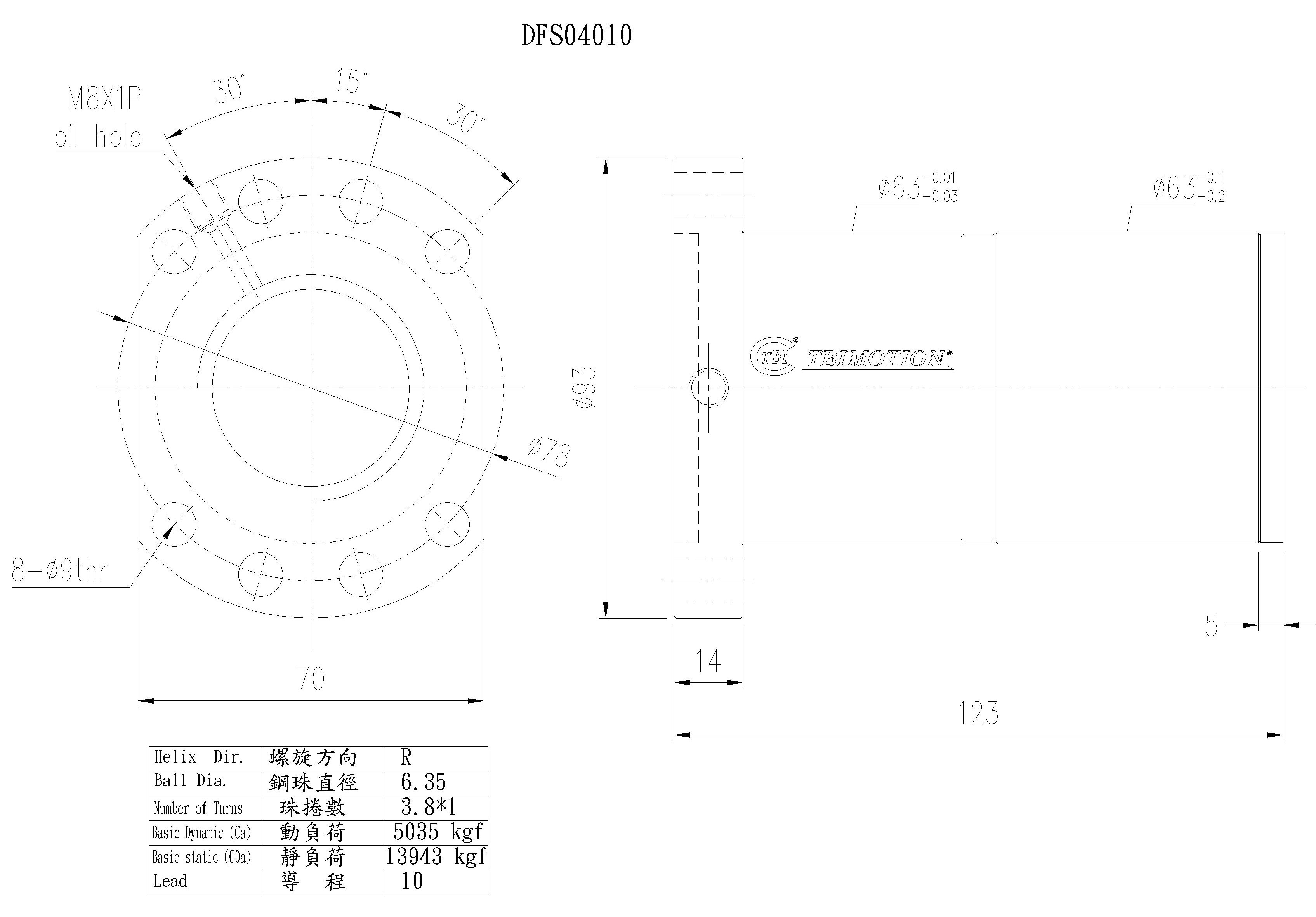 tbi滾珠絲桿螺母DFSR04005T1D,絲桿直徑40,導(dǎo)程05,珠圈數(shù)3.8*1,珠直徑3.175,雙切邊雙螺母,動額定負荷2018,靜額定負荷7589,剛性83.