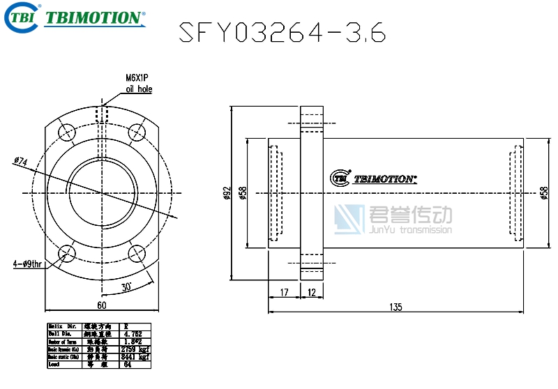 tbi滾珠絲桿螺母SFYR03264A2D,絲桿直徑32,導(dǎo)程64,螺母總長(zhǎng)135,珠直徑4.762,珠圈數(shù)1.8*2,動(dòng)額定負(fù)荷2579,靜額定負(fù)荷8441,剛性46.