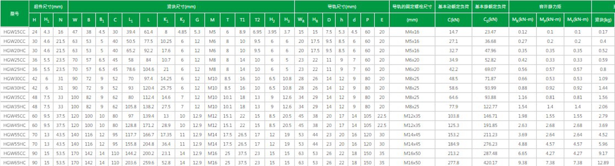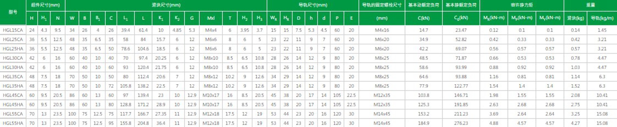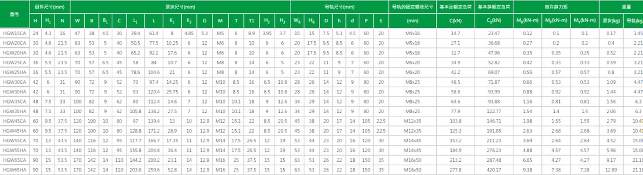 臺(tái)灣上銀直線導(dǎo)軌HG系列型號(hào)及參數(shù):
