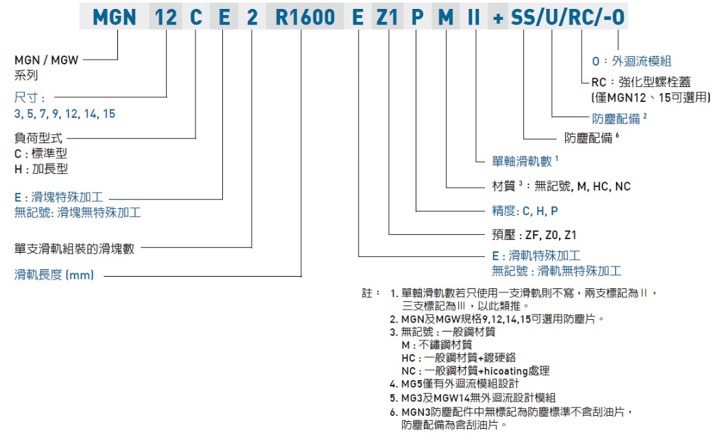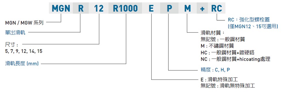 臺(tái)灣上銀直線導(dǎo)軌MG系列型號(hào)解析: