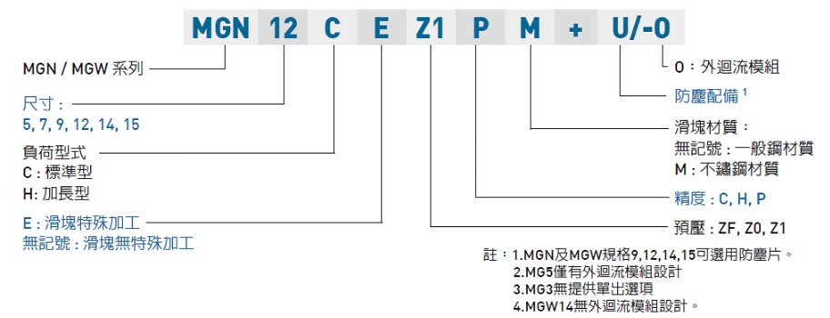 臺(tái)灣上銀直線導(dǎo)軌MG系列線性滑塊型號(hào)解析: