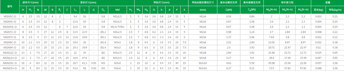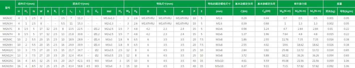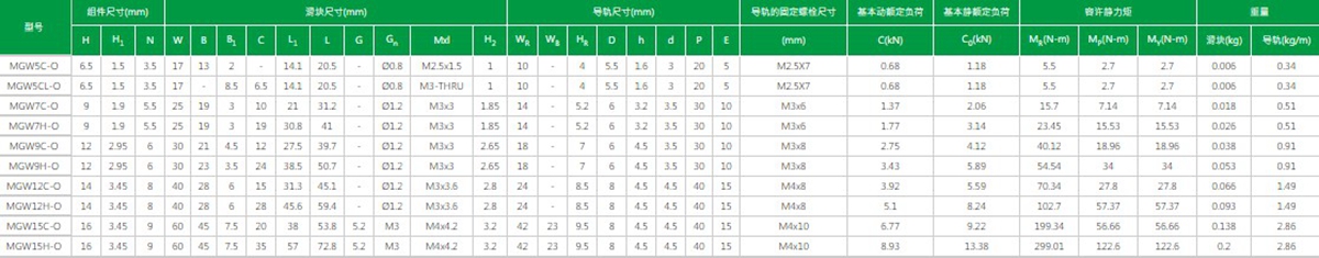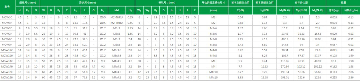 臺(tái)灣上銀直線導(dǎo)軌MG系列型號(hào)及參數(shù):