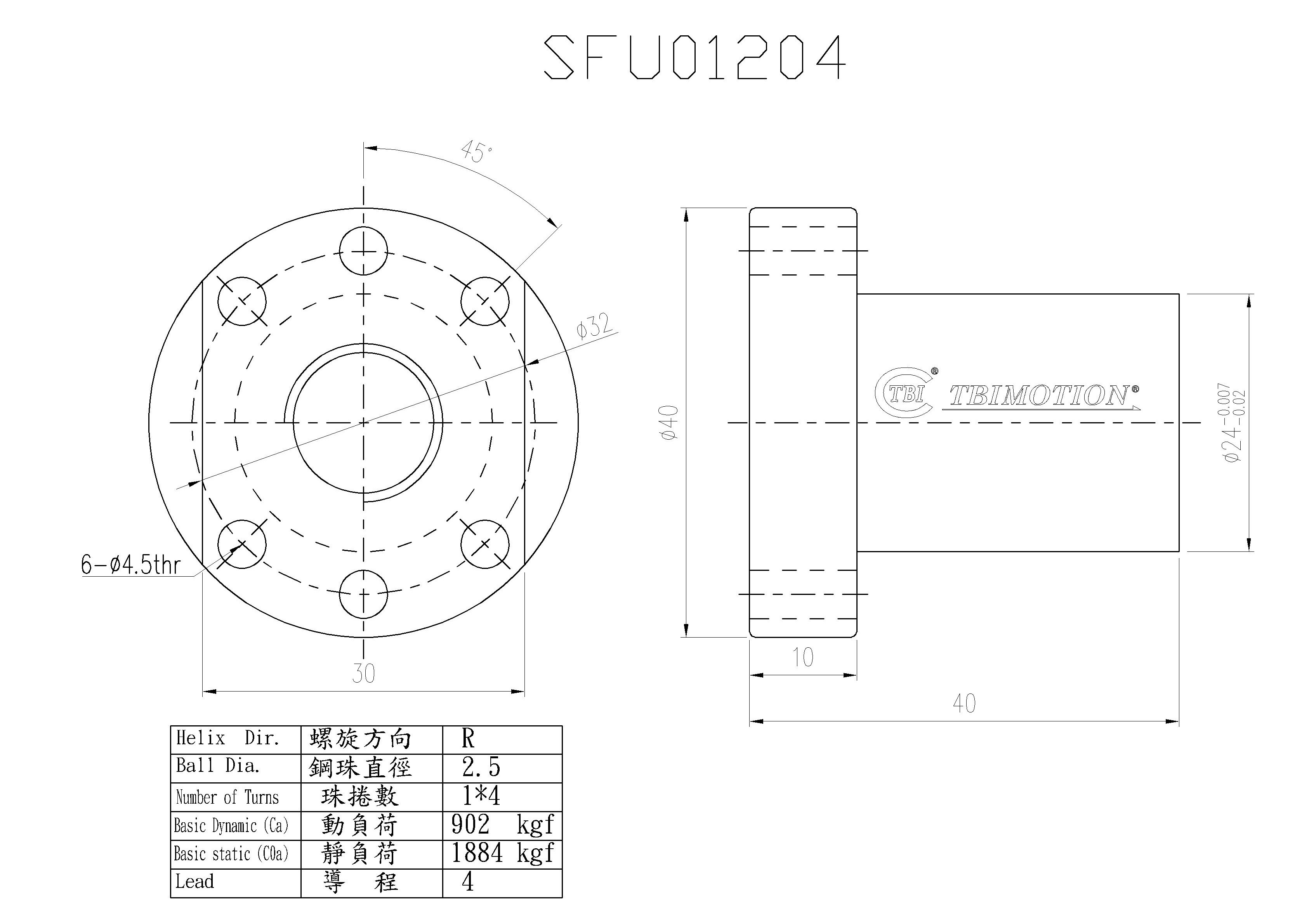 TBI滾珠絲桿螺母SFU1204T4D螺母尺寸圖示: