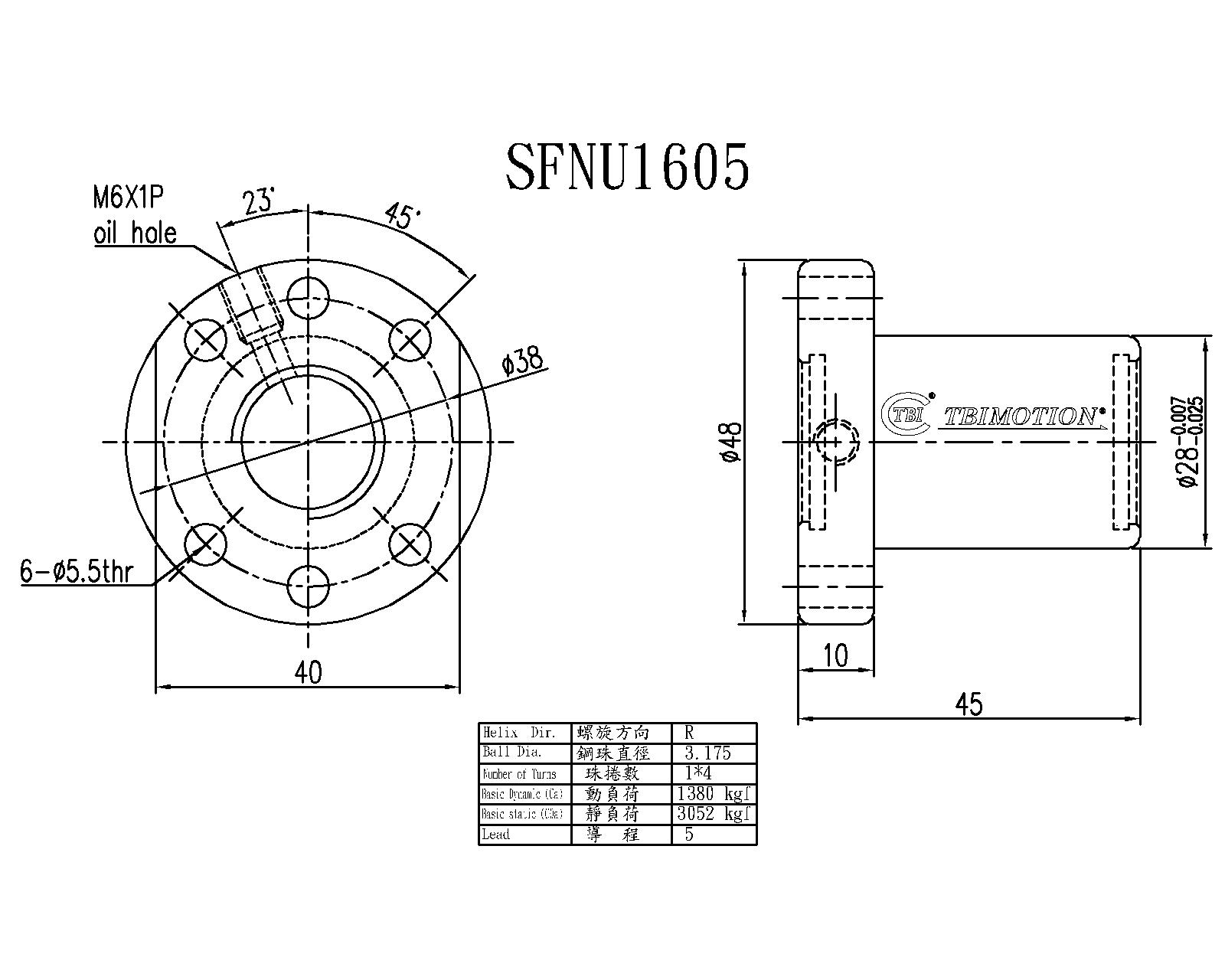 TBI滾珠絲桿螺母SFUNR01605T4D,絲桿直徑16,導(dǎo)程05,珠圈數(shù)4,鋼珠直徑3.175,雙切邊,安裝孔6孔,動(dòng)額定負(fù)荷1380,靜額定負(fù)荷3052,剛性32