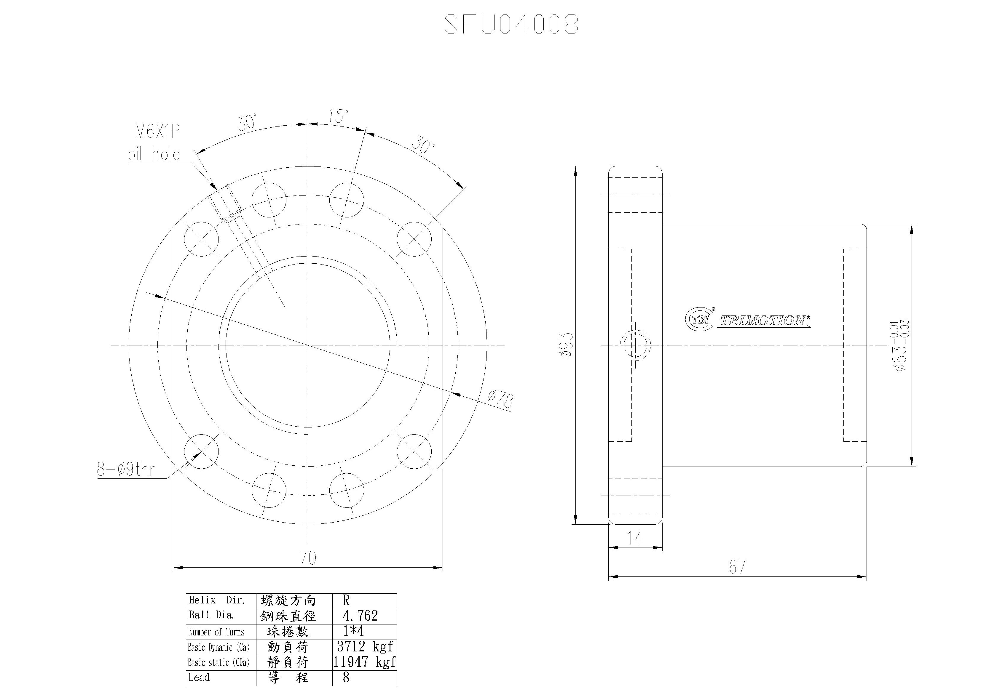 TBI滾珠絲桿螺母SFUR04008T4D,絲桿直徑40,導(dǎo)程08,珠圈數(shù)4,珠徑4.763,動額定負(fù)荷3712,靜額定負(fù)荷11947,剛性70.