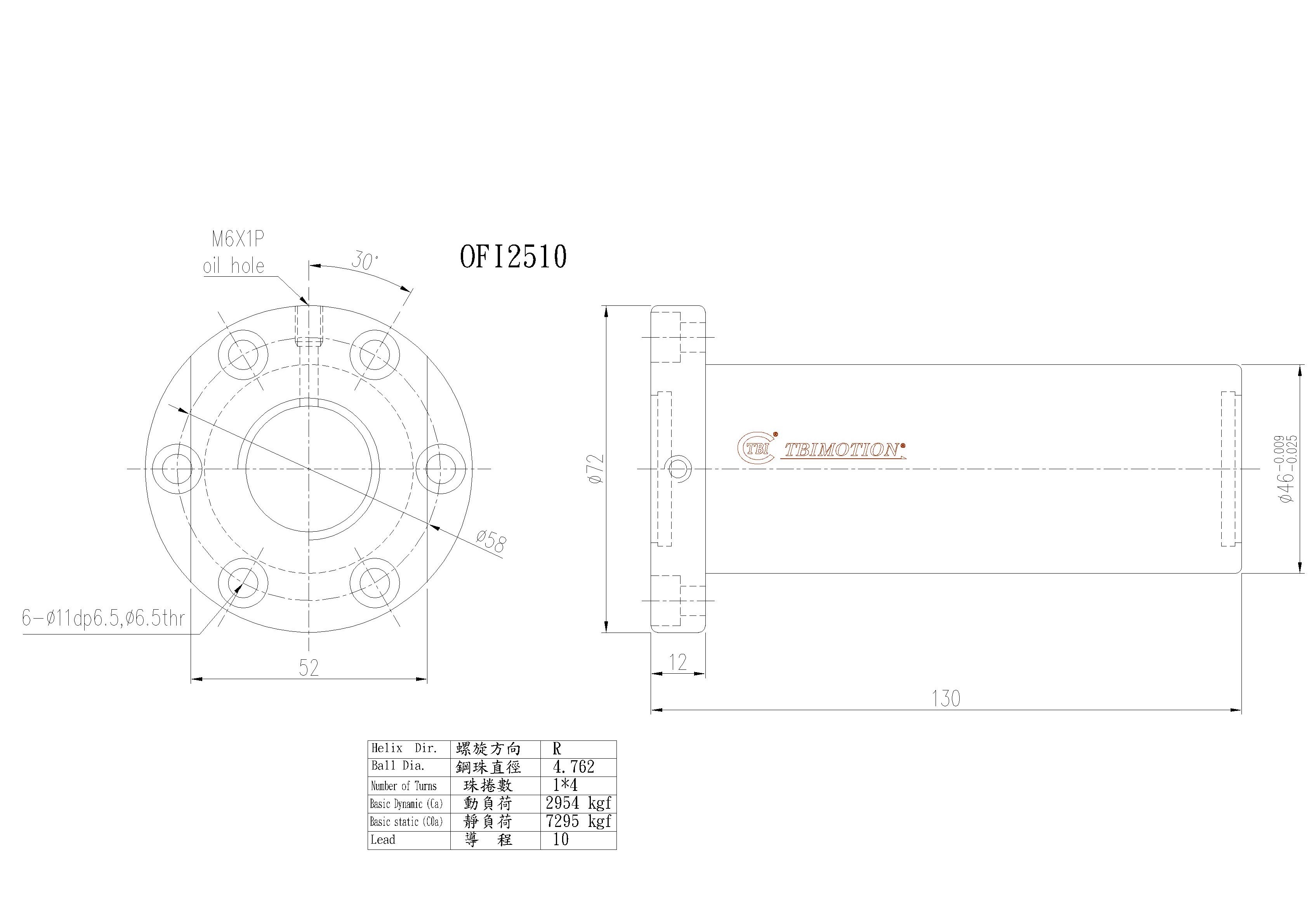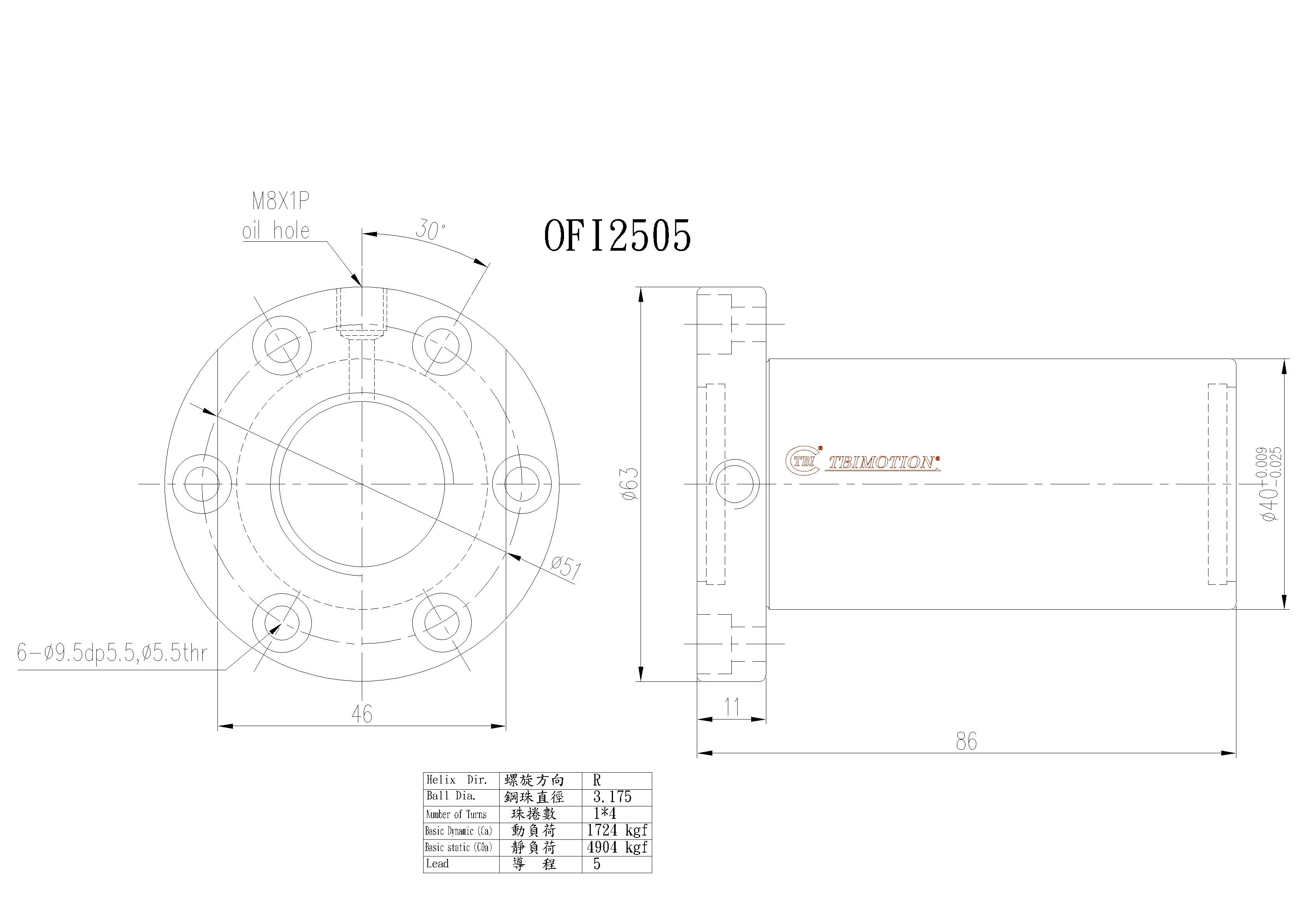 tbi滾珠絲桿OFI2505、OFI2510螺母尺寸圖示: