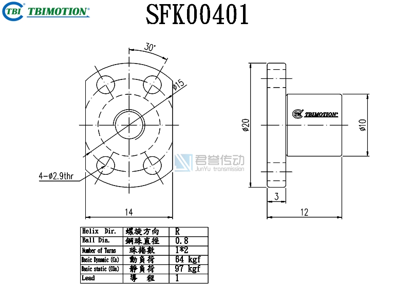 tbi滾珠絲桿螺母SFKR00401,絲桿直徑04,導(dǎo)程01,珠徑0.8,動(dòng)額定負(fù)荷64,靜額定負(fù)荷97,剛性5.
