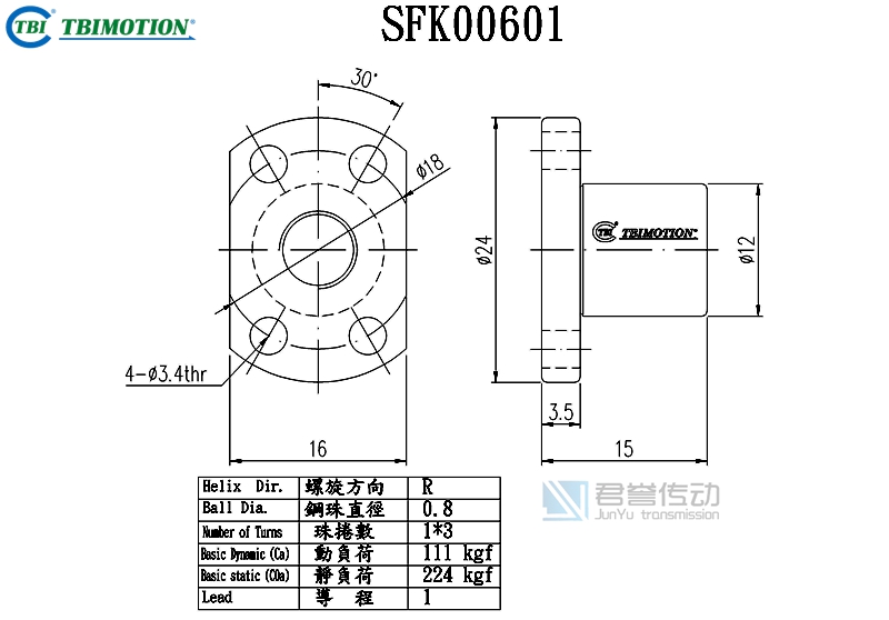 tbi滾珠絲桿螺母SFKR00601,絲桿直徑06,導(dǎo)程01,珠徑0.8,動(dòng)額定負(fù)荷111,靜額定負(fù)荷224,剛性9.