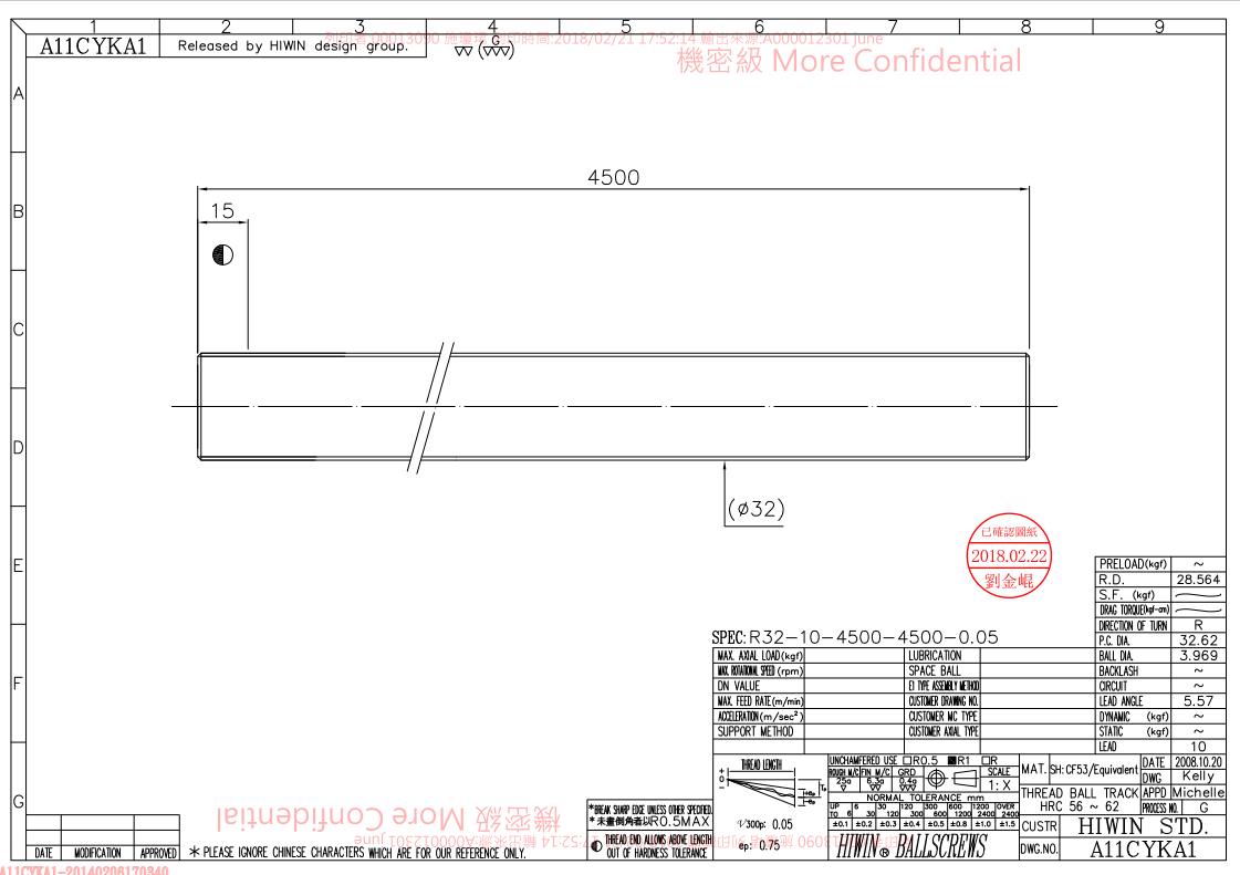 臺灣上銀滾珠絲桿R32-10K4-FSC-0.05,絲桿直徑32,導程10,珠徑3.969,絲桿重復定位精度0.05,螺母總長63,BCD65,絲桿動負荷2210KGF,靜負荷6470KGF。