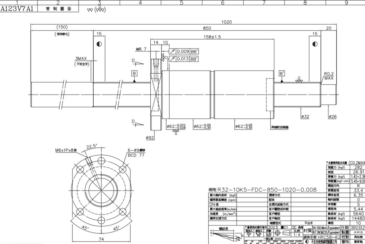 臺灣上銀滾珠絲桿R32-10K5-FDC-850-1020-0.008,高精密滾珠絲桿,機床絲桿,絲桿直徑32,導程10,珠徑6.35,絲桿重復定位精度0.008,C3級精度,螺母總長158,雙螺母,BCD77,絲桿動負荷5640KGF,靜負荷14480KGF。