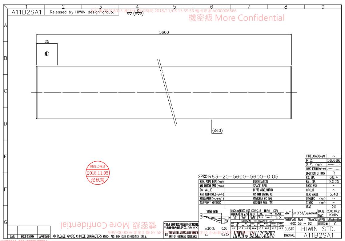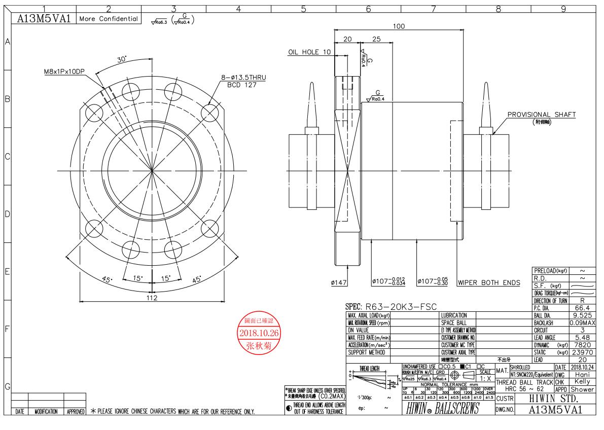 臺灣上銀滾珠絲桿R63-20K3-FSC-0.05,臺灣上銀高精密設備傳動部件,八孔雙切邊螺母,螺母總長100MM,螺母BCD107MM,珠徑9.525MM,絲桿動負荷7820KGF,靜負荷23970KGF,絲桿重復定位精度0.05MM。