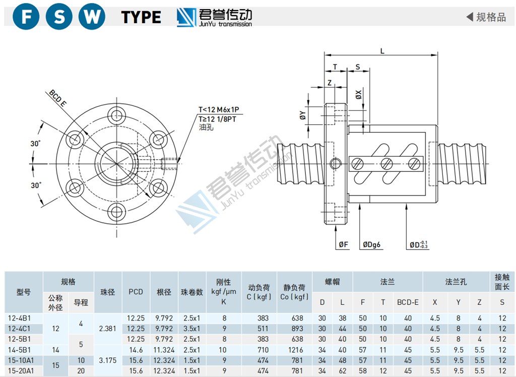 FSW系列重負(fù)荷外循環(huán)絲桿螺母、最小直徑12、最大直徑100、根據(jù)需求定制您的專(zhuān)屬絲桿、導(dǎo)程可咨詢(xún)東莞市君譽(yù)傳動(dòng)科技有限公司工程師